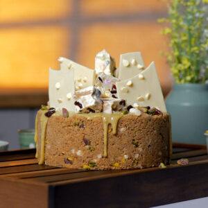 Base: plain digestive biscuit base with white chocolate chips and crushed pistachio’s