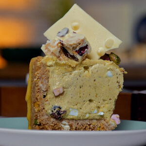 Filling: white chocolate and pistachio cheesecake with mini marshmallows, mixed dried berries, whole pistachio’s